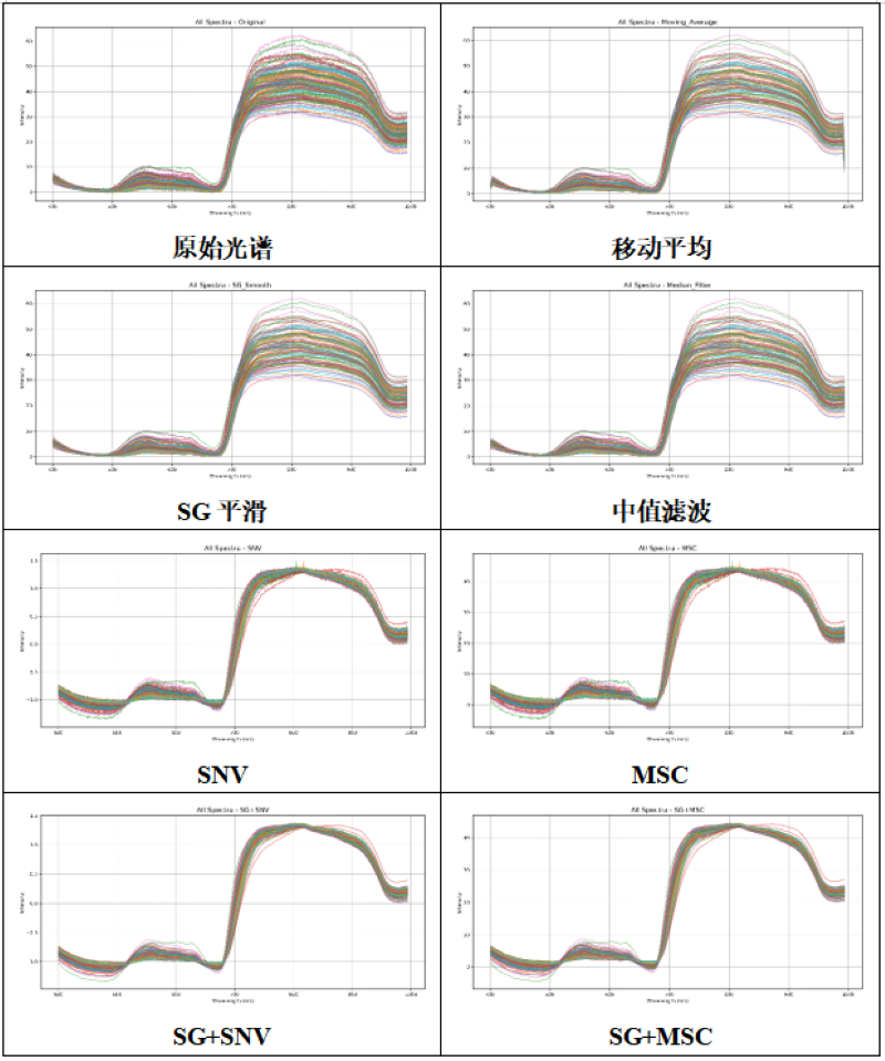 不同預處理方法處理后的光譜曲線如下圖所示。相對于原始光譜,平滑預處理方法(如Savitzky-Golay、移動平均和中值濾波)主要消除了光譜曲線上的高頻波動,使光譜曲線更平滑,同時保持了整體峰位和基線的基本形態。SNV方法則對原始光譜的幅值和偏移進行了標準化,使不同樣品的光譜在同一水平上對齊,同時略微改變了曲線的整體高度。MSC通過線性回歸校正光散射造成的幅值和偏移差異,既保持峰形特征,又消除了樣品間的散射差異。然而,SNV和MSC沒有消除光譜中的高頻噪聲。組合方法(如SG+SNV或SG+MSC)先對光譜進行高頻噪聲平滑,再進行散射校正,兼顧了平滑與散射校正的效果,使光譜既平整又保持峰形特征。通過對比處理前后的光譜,可以直觀觀察到各方法對噪聲、散射和基線的調節作用,從而選擇*適合的預處理策略。